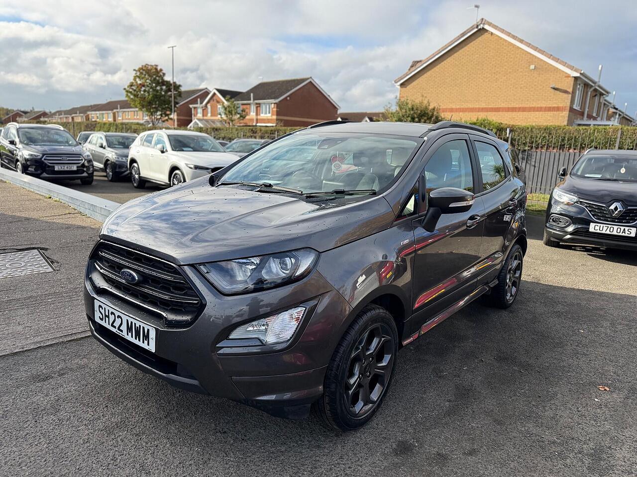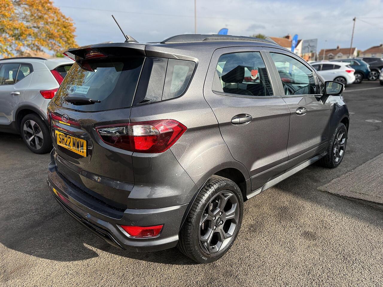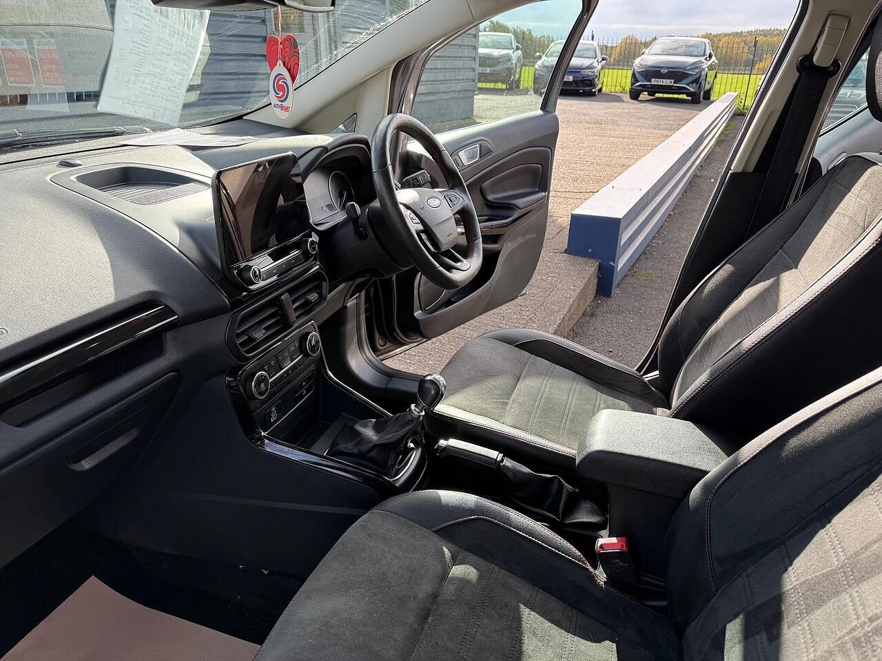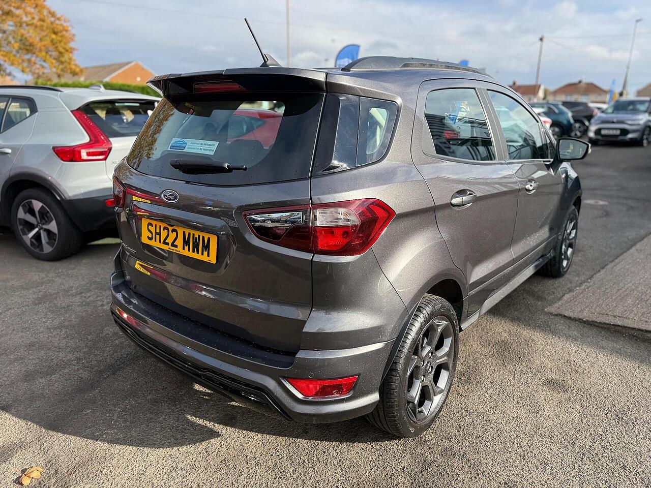 This 2022 Ford EcoSport ST-Line T is a superb example, boasting a full dealership service history and having had only one owner from new. This stylish compact SUV is powered by an efficient 1.0L petrol engine, meeting Euro 6 emissions standards. It comes equipped with a desirable Winter Pack, featuring heated seats and a heated steering wheel for ultimate comfort. For convenience and safety, it includes rear parking sensors and a rear view camera, complemented by automatic headlights.